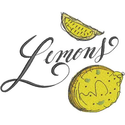 This embroidery design features the word "Lemons" in elegant script, accompanied by illustrations of whole and sliced lemons. Available in all hoop sizes.