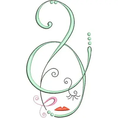 This digital machine embroidery design features a whimsical, stylized number two featuring decorative swirls, a playful face, and colorful accents.
