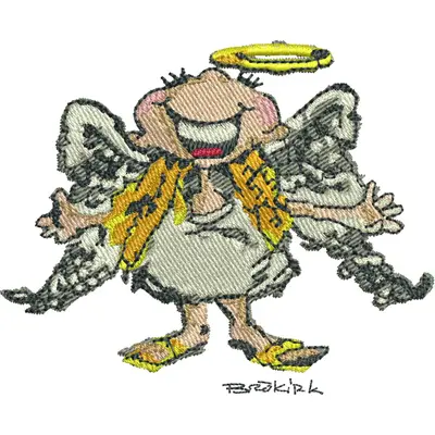 This digital machine embroidery design features a cheerful angel character with a halo, large wings, and a playful expression, wearing a white robe and bright yellow accents. Available for 4X4 hoops.