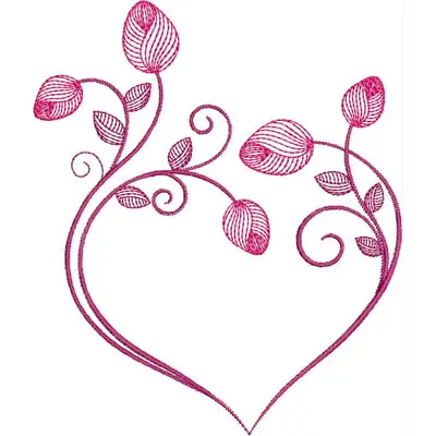This digital machine embroidery design features a heart shape formed by elegant swirling vines and delicate floral buds in shades of pink.