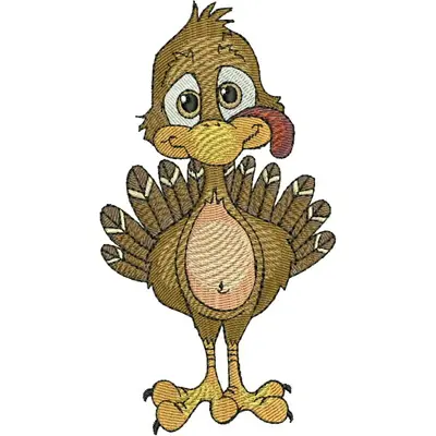 This digital machine embroidery design features a whimsical turkey with a cheerful expression, oversized features, and detailed feathers.
