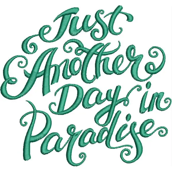This embroidery design features the phrase "Just Another Day in Paradise" featuring elegant, flowing script in a vibrant green color.