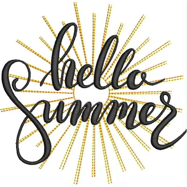 This embroidery design features the phrase "hello Summer" in stylish black lettering accented by golden rays.