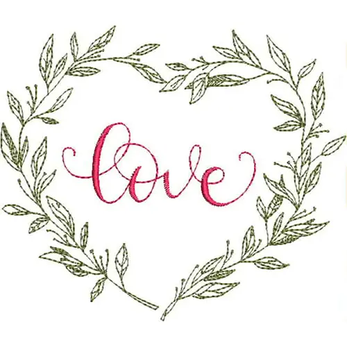 This digital machine embroidery design features the word "love" in a playful cursive style surrounded by a delicate wreath of leaves.