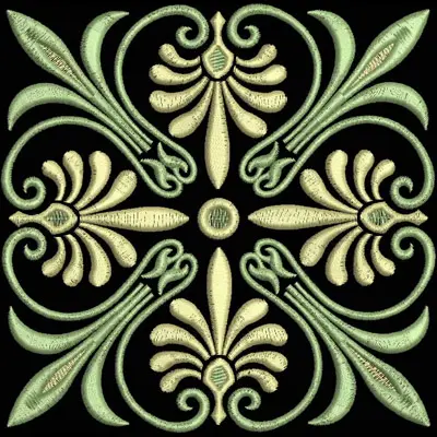 This digital machine embroidery design features intricate floral motifs featuring swirling leaves and symmetrical patterns in soft green and cream tones.