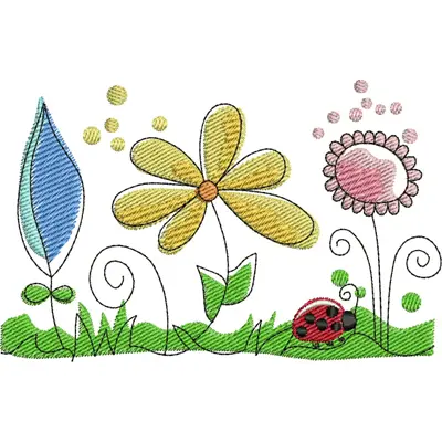This embroidery design features colorful flowers and a ladybug with playful swirls and leaves. Perfect for free embroidery designs embroidery projects.