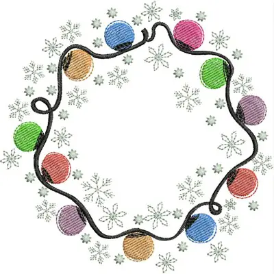 This digital machine embroidery design features a circular arrangement of colorful Christmas lights surrounded by small snowflakes.