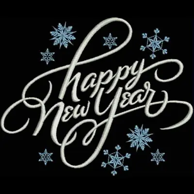 This embroidery design features the phrase "Happy New Year" in an elegant, flowing script, adorned with delicate snowflakes.