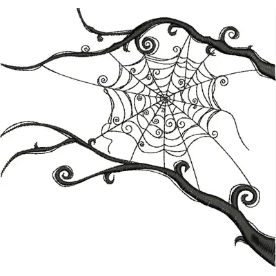This digital machine embroidery design features an intricate spider web entwined with beautifully curled branches.