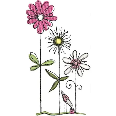 An embroidery design of colorful flowers with distinct petals and leaves, featuring a playful arrangement of pink, yellow, and white blooms.