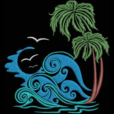 This digital machine embroidery design features stylized ocean waves with palm trees and seagulls.