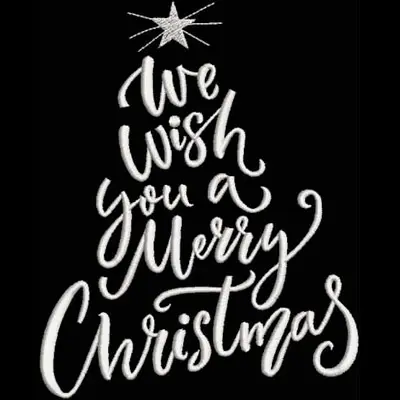 This embroidery design features a decorative Christmas tree made up of elegant lettering that says "We wish you a Merry Christmas," topped with a star.