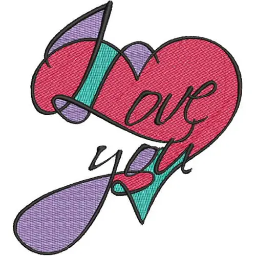 This embroidery design features a colorful heart with the words "I Love You" creatively integrated into the shape.