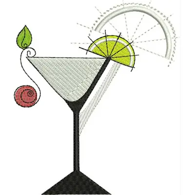 This digital machine embroidery design features a stylized cocktail glass featuring a lime wedge, a cherry, and a leaf in vibrant colors.