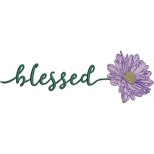 This digital machine embroidery design features the word "blessed" in flowing script with a purple flower embellishment.