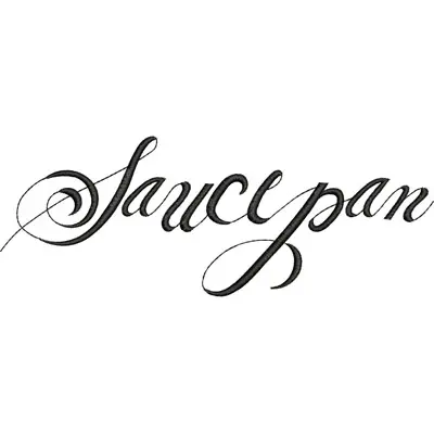 This digital machine embroidery design features the word "saucepan" in an elegant cursive font. Available in all hoop sizes.