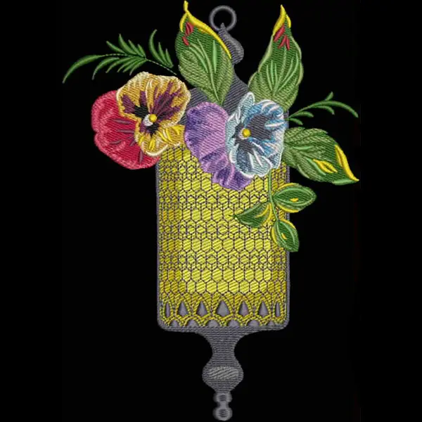 This digital machine embroidery design features a vibrant bouquet featuring colorful flowers and green leaves arranged elegantly in a yellow, textured vase. Available in all hoop sizes.