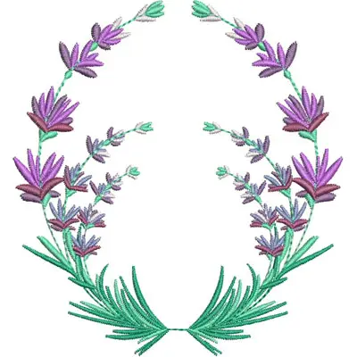 Digital machine embroidery design "SAS_Lavender Wreath" in the 4x4 theme for 4x4 hoops an embroidery design of delicate purple flowers and green foliage arranged in a decorative arch shape. from Kreations by Kara.