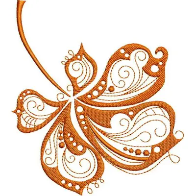 This digital machine embroidery design features a stylized, ornate flower with swirling lines and intricate details in a warm orange hue. Available in all hoop sizes.