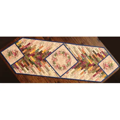 An embroidery design of a geometric table runner featuring a patchwork of colorful fabric strips and floral motifs..