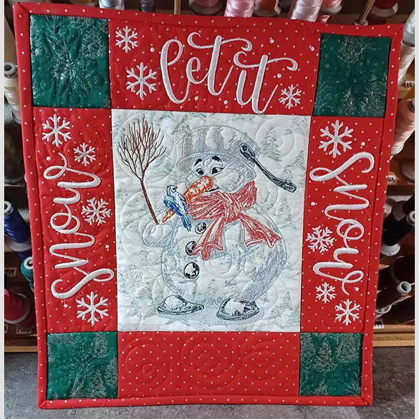 This digital machine embroidery design features a cheerful snowman holding a broom and adorned with a red scarf, surrounded by decorative text that reads "Let it Snow." Available for 8X10 hoops.