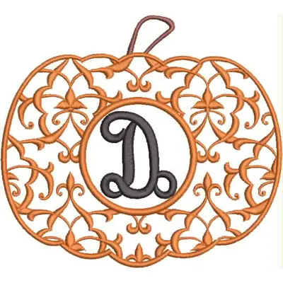 This digital machine embroidery design features an intricately stitched pumpkin featuring a decorative floral pattern and a central letter "D". Available in all hoop sizes.