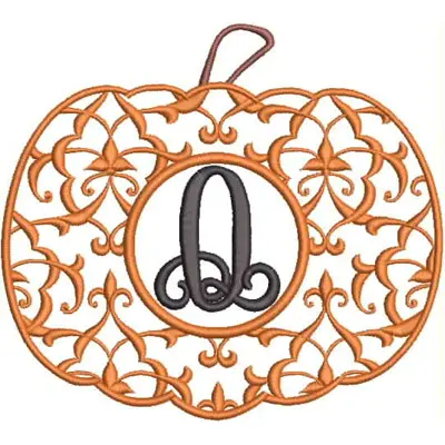 This digital machine embroidery design features a decorative pumpkin with intricate swirls and a central letter "Q." Available in all hoop sizes.
