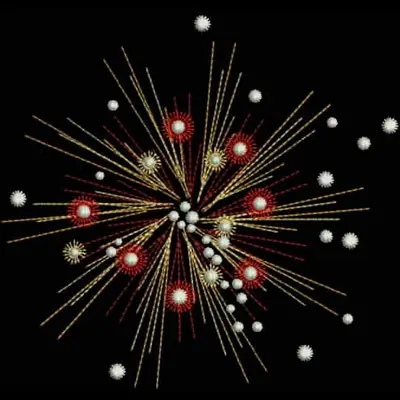 This embroidery design features an explosion of vibrant bursts featuring long golden, red, and white lines accented with circular elements reminiscent of fireworks.