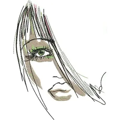 This digital machine embroidery design features a stylized face featuring distinctive features, with striking green accents in the eye and flowing hair. Available in all hoop sizes.