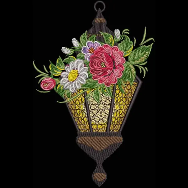 This embroidery design features a vintage lantern adorned with colorful flowers including roses and daisies. Available in all hoop sizes.
