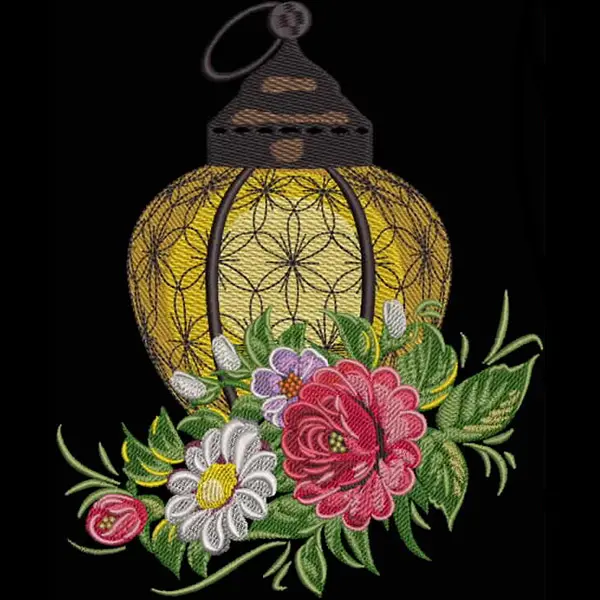 This embroidery design features a yellow lantern surrounded by vibrant flowers, including roses, daisies, and greenery. Available in all hoop sizes.