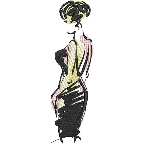 This digital machine embroidery design features a stylized female figure in a fitted dress, featuring soft lines and a minimalist color palette. Available in all hoop sizes.