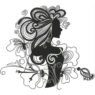This digital machine embroidery design features a stylized silhouette of a woman with flowing hair, surrounded by floral elements. Available in all hoop sizes.
