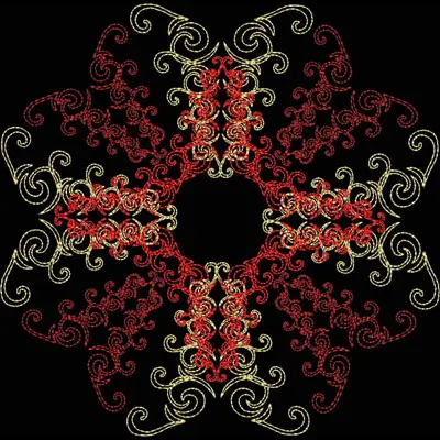 This embroidery design features intricate swirling patterns in red and gold, forming a symmetrical star-like shape. Available for 6X6 hoops.