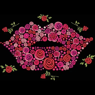 This digital machine embroidery design features a vibrant pair of lips adorned with intricate roses and swirling floral patterns in shades of pink and red. Available in all hoop sizes.