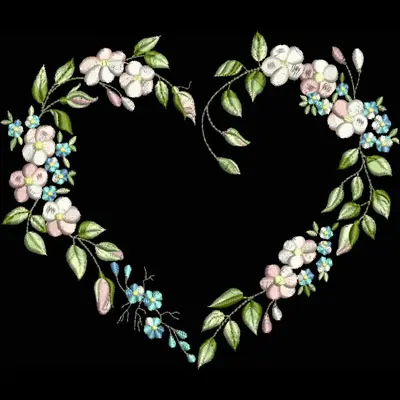 This embroidery design features a heart shape created with delicate pink and white flowers, complemented by green leaves and small blue blossoms.
