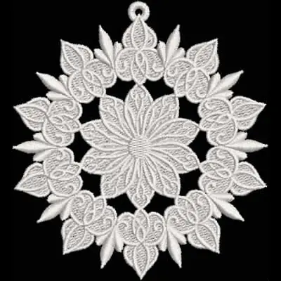 Digital machine embroidery design "LO FSL Ornament 11" in the artist - white dove theme for 3x3, 4x4 and all hoops an embroidery design of a circular floral motif featuring a central star-shaped flower surrounded by detailed petal shapes arranged symmetrically. from Kreations by Kara.