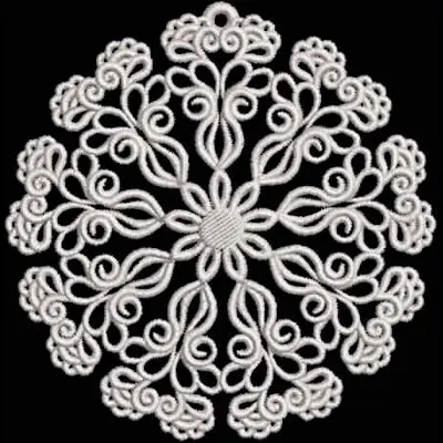 This digital machine embroidery design features an intricate snowflake featuring swirling patterns and rounded shapes. Available in all hoop sizes.