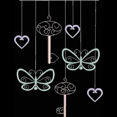 Digital machine embroidery design "Lock N Key" in the artist - white dove theme for all hoops an embroidery design of whimsical butterflies, a decorative mushroom, and hanging hearts all rendered in soft pastel colors. from Kreations by Kara.