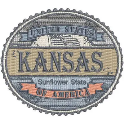 This embroidery design features a circular patch featuring the word "Kansas," the phrase "Sunflower State," and decorative elements representing the United States.