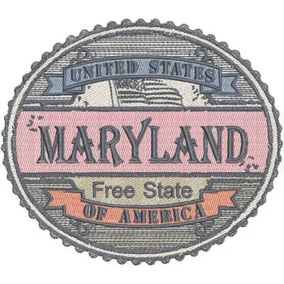 This digital machine embroidery design features a circular patch featuring the words "MARYLAND" and "Free State of America" in a vintage style, adorned with an illustration of the American flag. Available in all hoop sizes.
