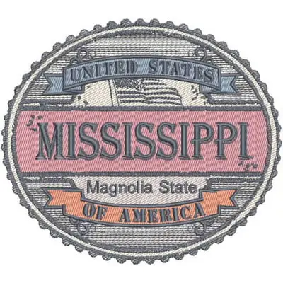 This digital machine embroidery design features a circular badge featuring the text "MISSISSIPPI" along with "Magnolia State" and "United States of America" in decorative colors and styles. Available in all hoop sizes.
