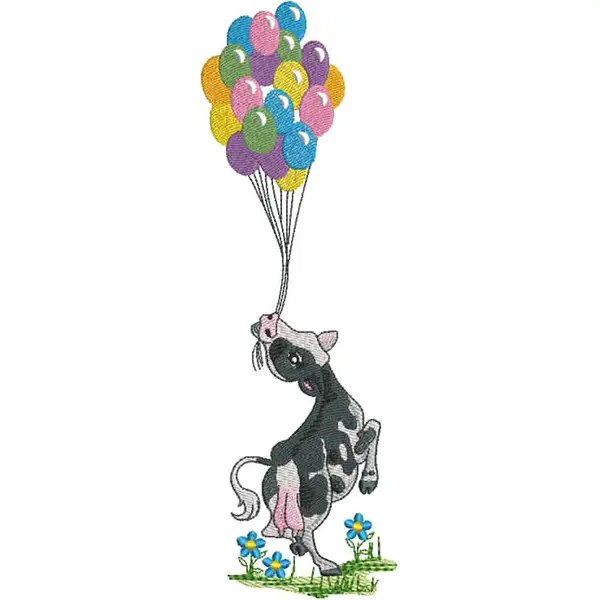 This digital machine embroidery design features a playful black and white cow joyfully holding colorful balloons while standing on its hind legs. Available in all hoop sizes.
