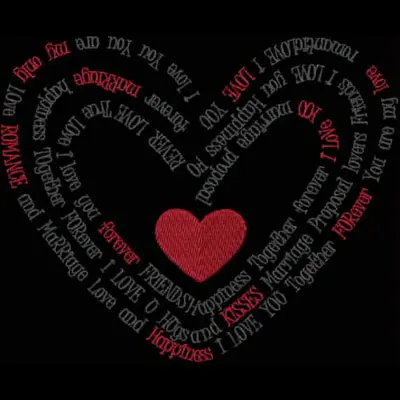 This digital machine embroidery design features a heart made up of various words expressing love, romance, and friendship, centered around a red heart motif. Available for 5X7 hoops.