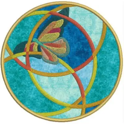 This digital machine embroidery design features a colorful butterfly intertwined with abstract circular lines in a vibrant circular pattern. Available in all hoop sizes.