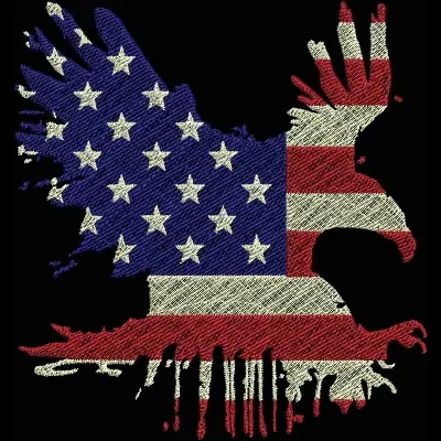 This digital machine embroidery design features an eagle silhouette filled with the American flag, featuring stars and stripes in red, white, and blue. Available in all hoop sizes.