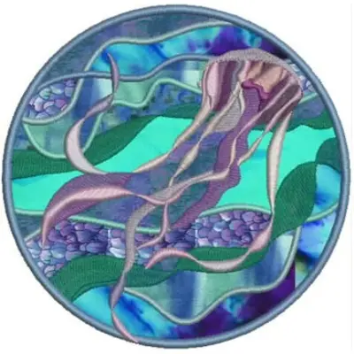 This digital machine embroidery design features a flowing jellyfish in shades of purple and teal against a colorful, wavy background. Available in all hoop sizes.