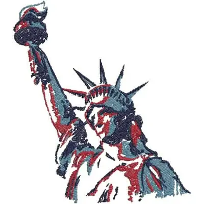 This digital machine embroidery design features the Statue of Liberty, holding a torch aloft with a flowing robe, crafted in a blend of red, white, and blue threads. Available in all hoop sizes.