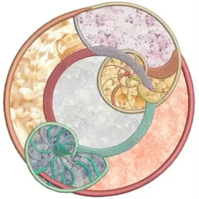 This digital machine embroidery design features interconnected circular shapes featuring intricate patterns and a variety of soft colors. Available in all hoop sizes.