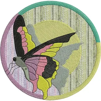 This digital machine embroidery design features a colorful butterfly featuring vibrant pink, yellow, and black details, enclosed in a circular shape. Available in all hoop sizes.